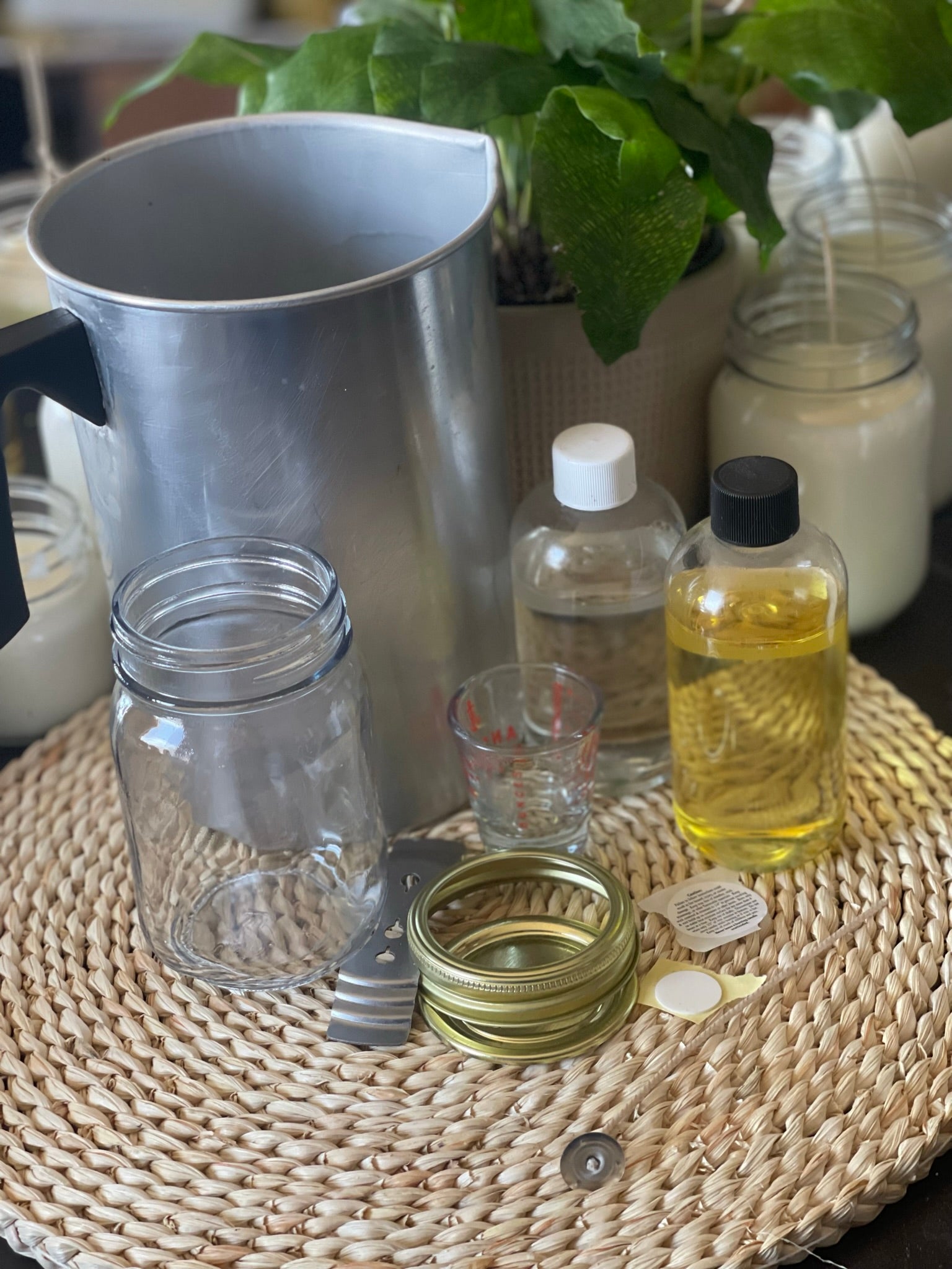 We supply you with 1 glass jar, that you will wick with our cotton braided wick. As that sets, you will sniff through our large selection of available fragrance oils. Once you have narrowed it down to the two that you want to blend to create your very own unique scent, add the wax then pour into the vessel. As your candle is curing, let your creative juices flow as you come up with a unique name + design for your label.
